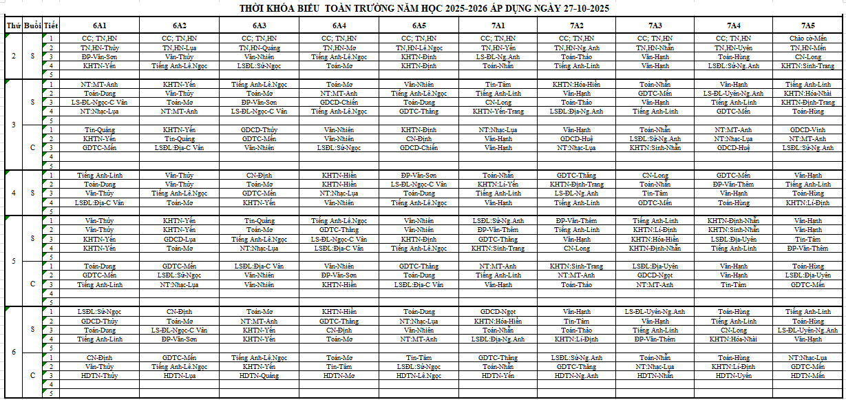 THỜI KHÓA BIỂU TKB NĂM HỌC 2025-2026 ÁP DỤNG TỪ NGÀY 08-09-2025